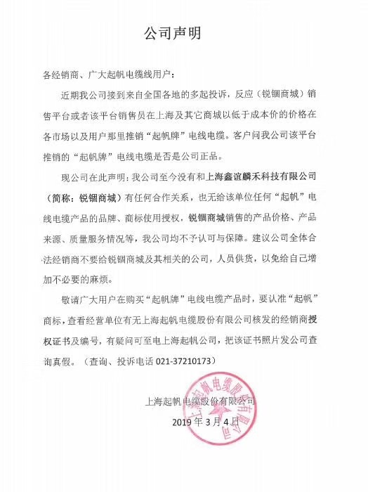 關(guān)于網(wǎng)上商城銳錮銷售起帆牌電纜公告!