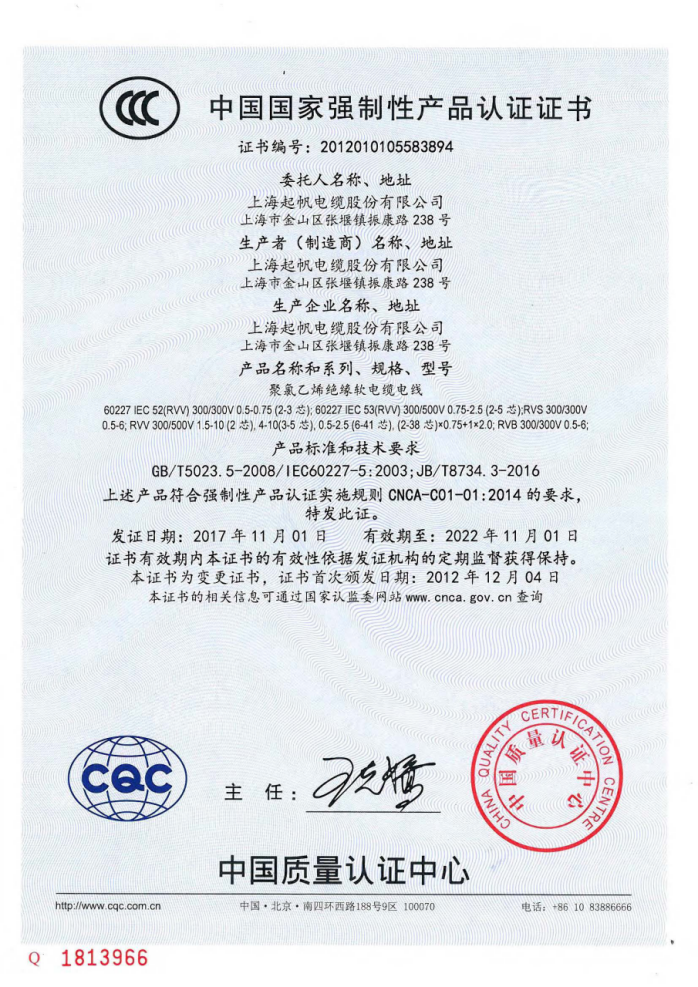 中國國家強制性產(chǎn)品認證證書RVV聚氯乙烯絕緣軟電纜電線