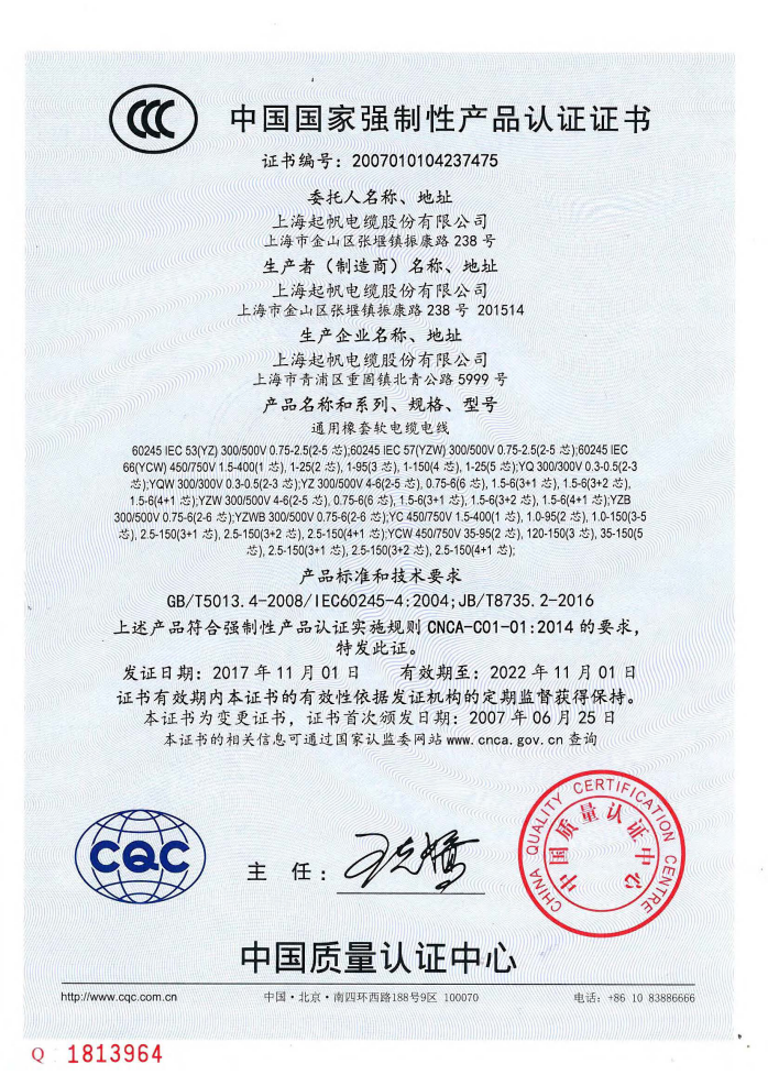中國國家強制性產(chǎn)品認證證書YZ橡套軟電線電纜