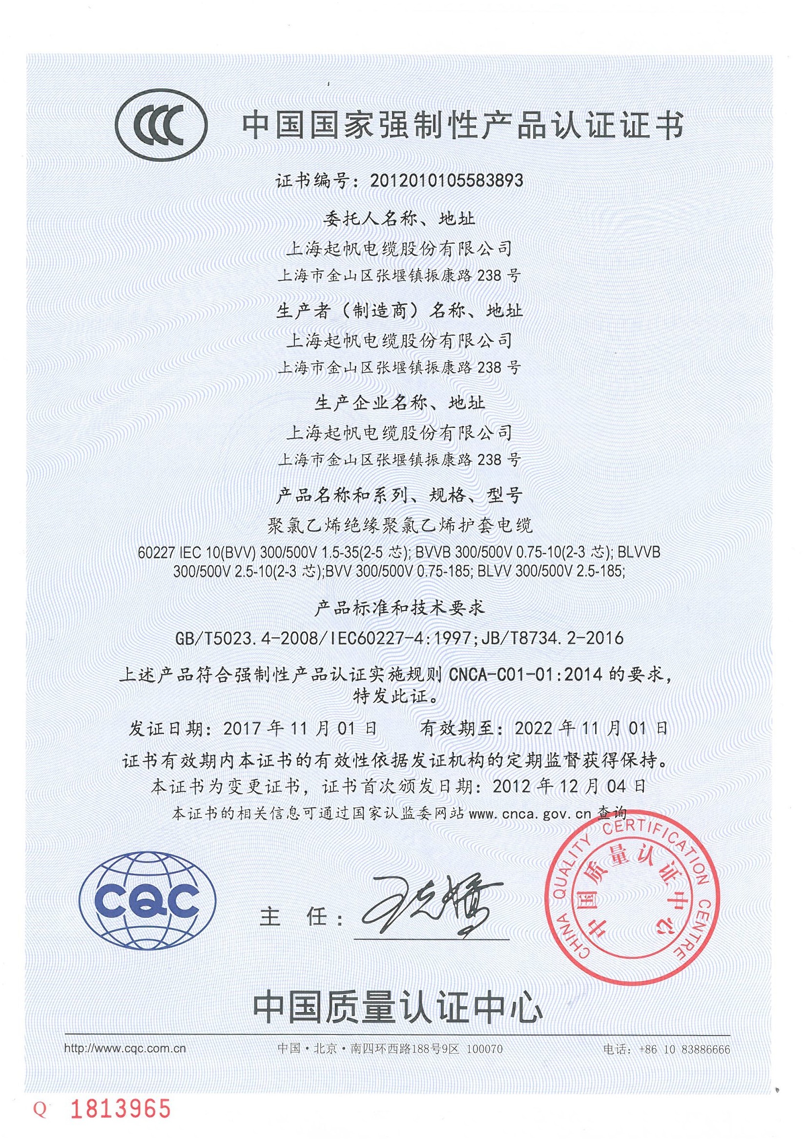 中國國家強制性產(chǎn)品認證證書BVV聚氯乙烯護套電纜