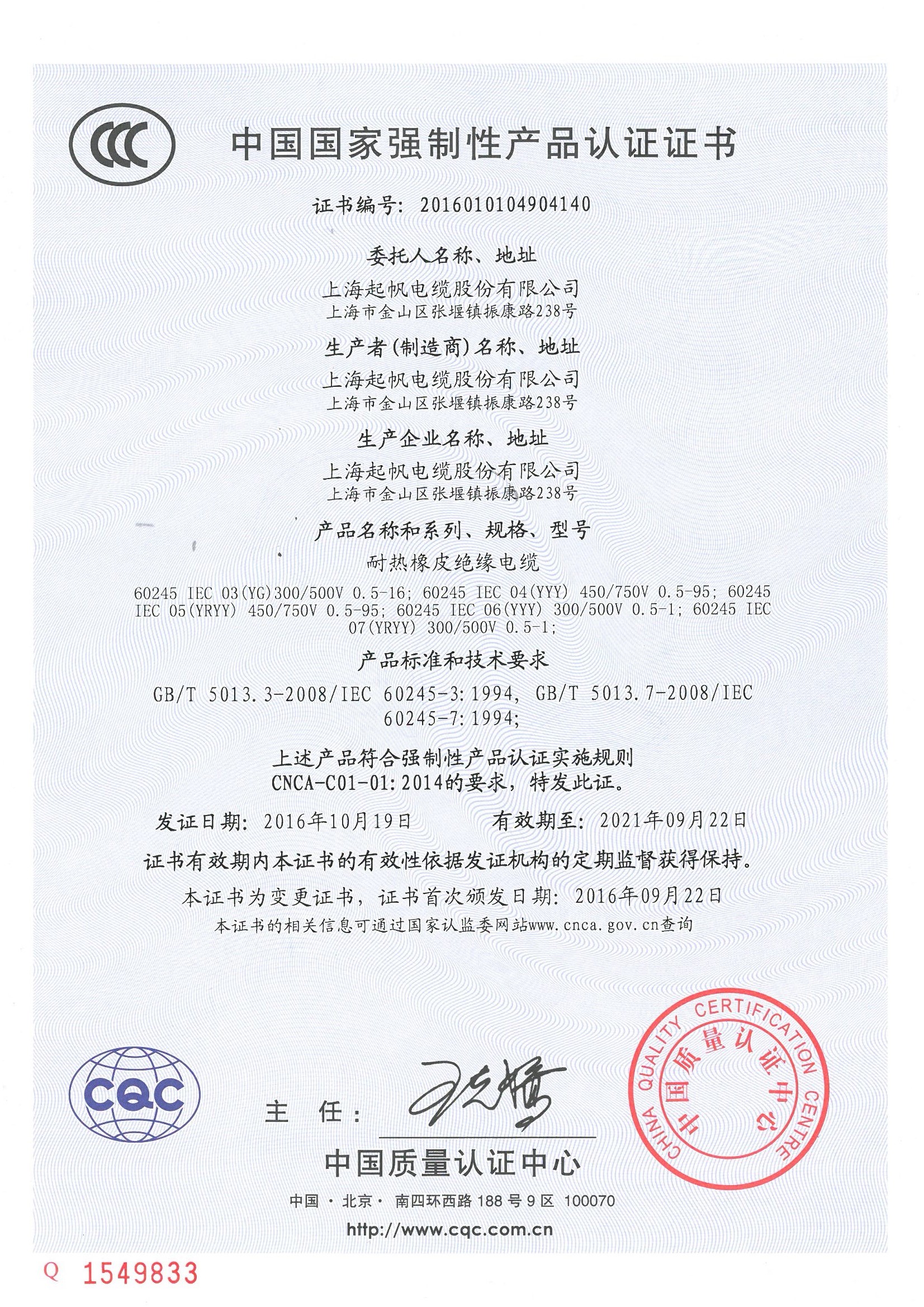 中國國家強制性產(chǎn)品認證證書YG橡皮絕緣電纜